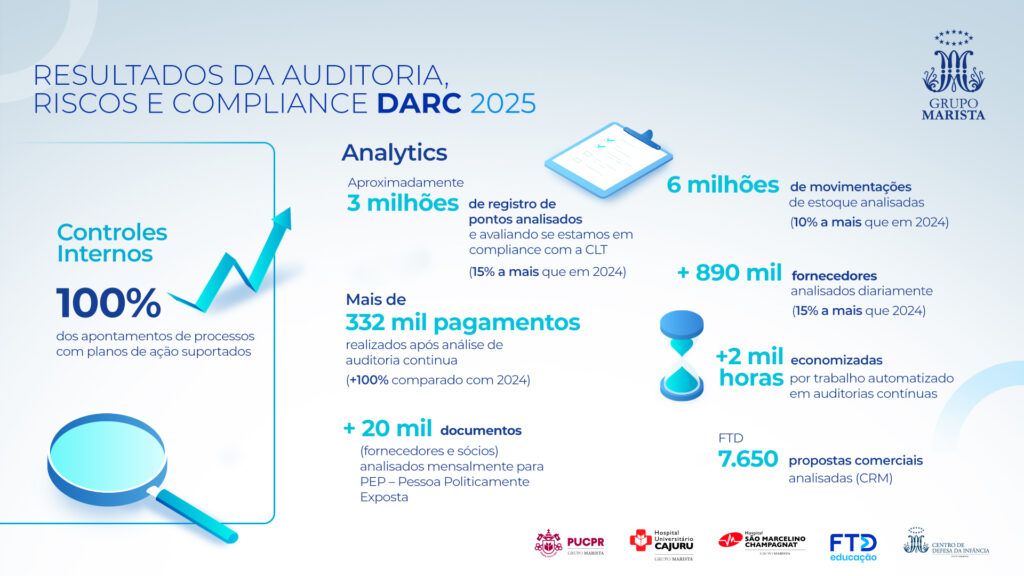 As atividades de Auditoria Contínua e Analytics também ampliaram sua abrangência, com milhões de registros analisados em processos como controle de ponto, pagamentos, estoque e monitoramento de fornecedores. A automação dessas análises gerou economia superior a 2 mil horas de trabalho.